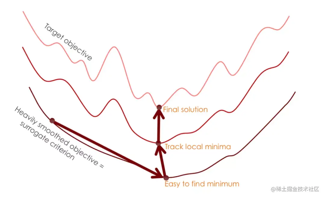 假设我们的目标优化函数超曲面是最上方的一个曲线,下面的曲线分别是简单的优化函数超曲面,位置越下面说明训练数据越简单。可以看到,如果一开始就选择优化目标超曲面,模型很可能会陷入到局部峰值中,但是如果通过一系列合理的中间优化函数由简到难逐步逼近目标函数,那么模型就很可能跳出局部峰,达到更优解。