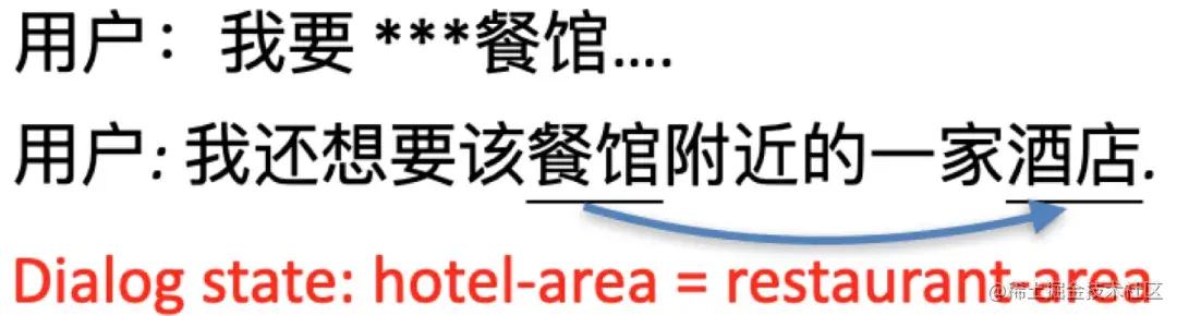 - 不同槽之间的取值存在指代关联。例如用户在前几轮交互已经预定好了某家餐馆,在当前轮时,用户说 “我还想要该餐馆附近的一家酒店”,那么隐含地,酒店的area 槽值应当和餐馆的 area 槽值是一致的,这需要DST模型有能力识别出来。