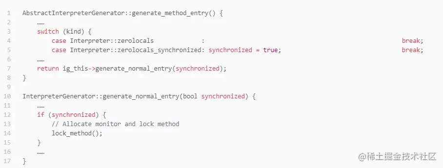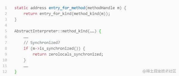 如果是synchronized修饰方法,在链接阶段绑定执行流zerolocals_synchronized。这两者的区别是什么呢?其实生成的执行流是同一套代码,区别就是有个判断,如果是synchronized修饰的方法,会执行lock_method。看代码。