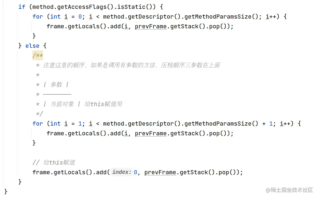 这个运行环境包括:创建栈帧、从调用者堆栈拷贝参数、给this指针赋值…如果是synchronized修饰的方法,还需要:根据是否是静态方法来计算出锁对象,即是当前对象实例还是Class对象、进行上锁…