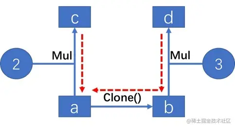 此时a和b不共享内存,但是从c-->a以及从d-->b的梯度值都会叠加到a上。也就是从a--->b进行了一个恒等映射。图中蓝色是原数据计算,红色是梯度走向。