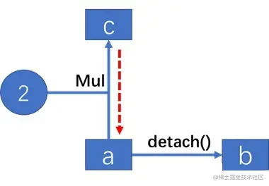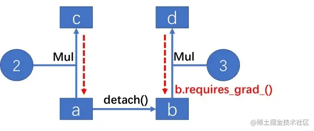 如果在detach语句后增加一条语句 b.requires_grad(),那么此时pytorch会计算跟踪其有关计算,但是此时梯度不会从b流向a。