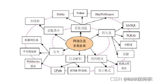 知识的广度和深度都很重要。作为一名程序员,能深入把握技术细节,是写出优质代码的保证。但对于一名项目经理而言,知识的广度更显重要。项目中碰到的问题往往具有综合性,只有具备广博的知识,才能快速对问题进行分析和定位。在程序员成长的道路上,我们必须有意识地扩大自己的知识面,形成更完善的知识体系。 我曾经编写过一个网络信息采集软件,这个软件可以从具有列表页的网站中按字段设置采集信息,支持自定义字段、页面多级关联、下载附件、支持多种数据库、可视化定义等特性。刚开始,我认为这个软件只是一个比较大的功能点而已,后来发现这个不起眼的功能关联着大量的知识点(如下图所示)。