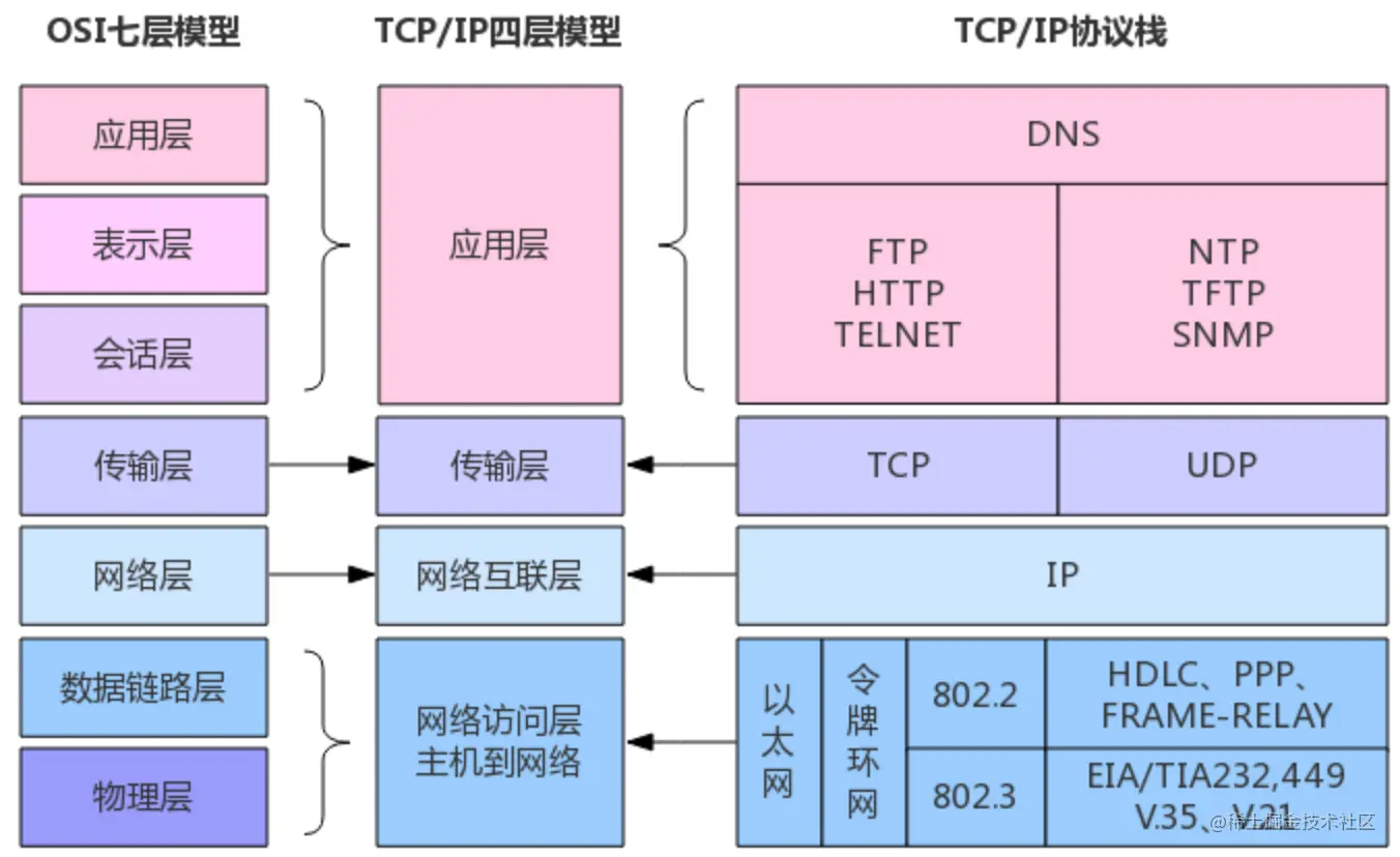 OSI(Open System Interconnection,开放式通信互联) 是由 ISO(International Organization for Standardization,国际标准化组织) 制定的标准模型。旨在将世界各地的各种计算机互联。然而,OSI 模型过于庞大、复杂。参照此模型,技术人员开发了 TCP/IP 协议栈,简化 OSI 七层模型为 TCP/IP 四层模型。获得了更广泛的使用。