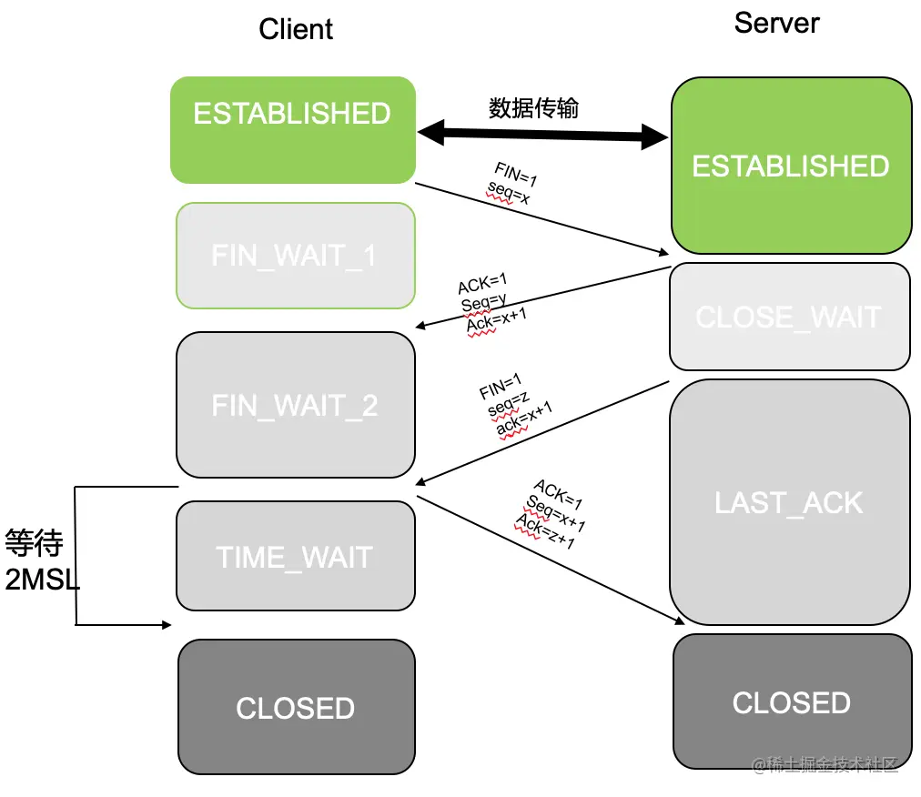 - 第一次挥手:client端向server端发送断开连接的请求,告诉server端,我这边不再需要跟你传输数据。发送FIN=1(表示发送断开连接请求),seq=x,此时client端处于FIN_WAIT_1阶段