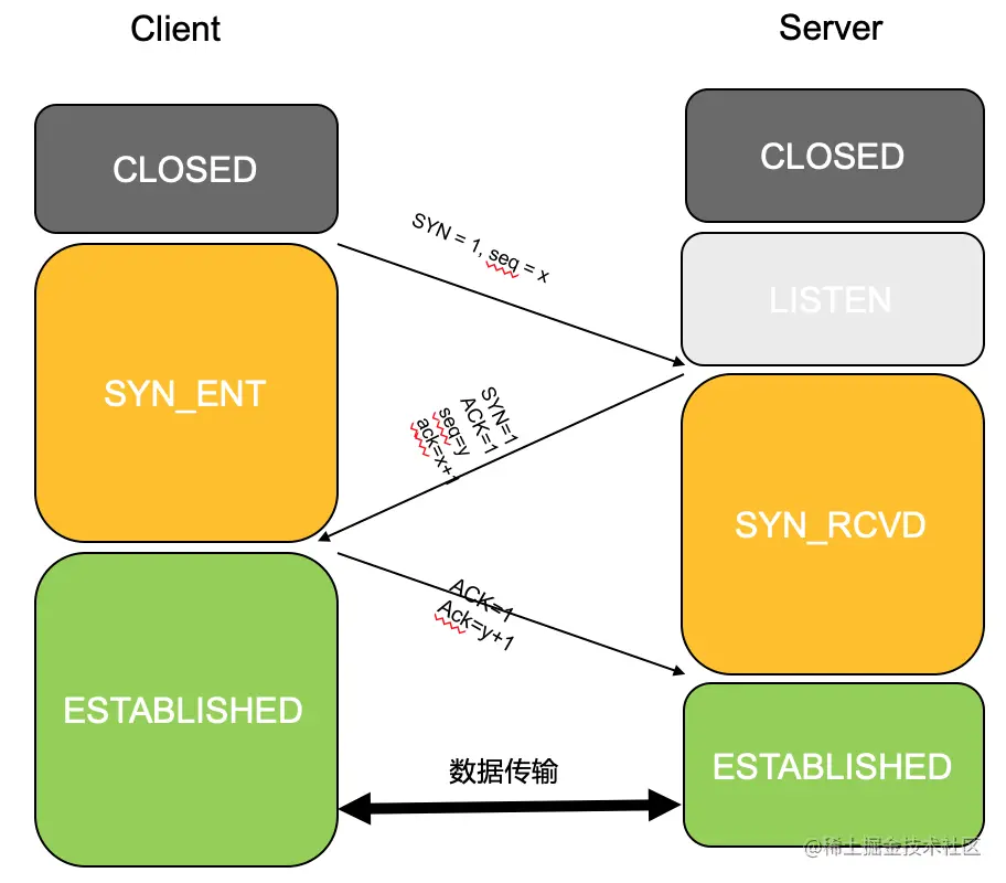 - 第一次握手:client端向server发送连接请求,SYN=1(SYN表示发送端与接收端要建立连接),seq = x。此时client端进入SYN_SENT阶段
