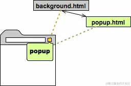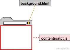 下图显示了一个browser action的弹窗的架构。弹窗的内容是由HTML文件(popup.html)定义的web页面。它不必复制背景页面(background.html)里的代码,因为它可以直接调用背景页面中的函数。