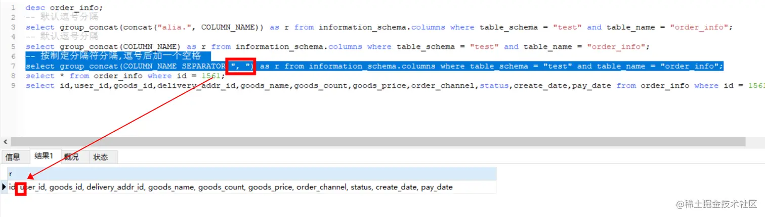 select group_concat(COLUMN_NAME SEPARATOR ", ") as r from information_schema.columns where table_schema = "test" and table_name = "order_info"
