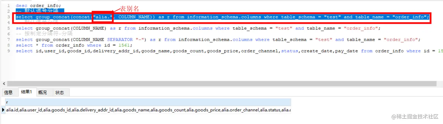 select group_concat(concat("alia.", COLUMN_NAME)) as r from information_schema.columns where table_schema = "test" and table_name = "order_info";