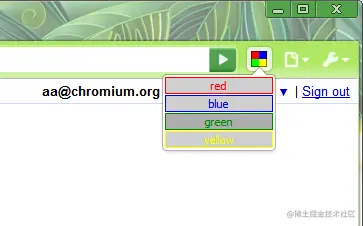 如下图, 地址栏右侧的彩色正方形是一个browser action的图标, 图标下面的是popup。
