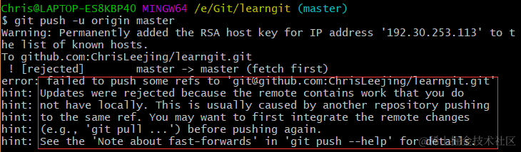 注:在GitHub上创建新仓库时,如果勾选了README.md选项时,可能会出现下面错误,提示:远程仓库有readme.txt,而本地仓库没有README.txt,此时应该先进行合并文件,再进行推送。