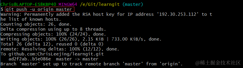 再次执行:git push -u origin master, 即可推送本地仓库到远程仓库了