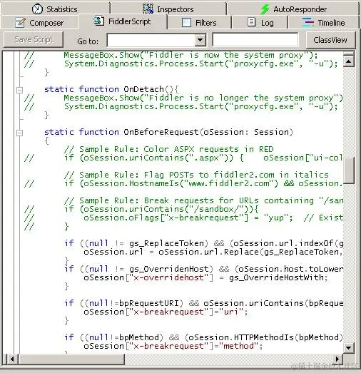 Fiddler最复杂的莫过于script系统了 官方的帮助文档: www.fiddler2.com/Fiddler/dev…