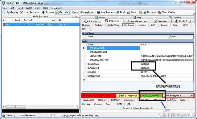 1. 用IE 打开博客园的登录界面 passport.cnblogs.com/login.aspx2. 打开Fiddler, 在命令行中输入bpu passport.cnblogs.com/login.aspx3. 输入错误的用户名和密码 点击登录4. Fiddler 能中断这次会话,选择被中断的会话,点击Inspectors tab下的WebForms tab 修改用户名密码,然后点击Run to Completion 如下图所示。5. 结果是正确地登录了博客园