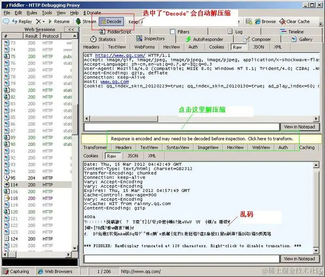 有时候我们看到Response中的HTML是乱码的, 这是因为HTML被压缩了, 我们可以通过两种方法去解压缩。