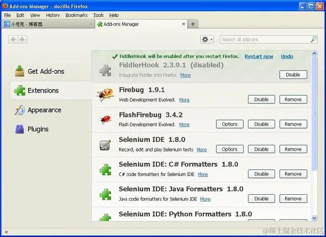 当你安装fiddler后, 就已经装好了Fiddler hook插件, 你需要到firefox中去启用这个插件打开firefox tools->Add ons -> Extensions 启动 FiddlerHook