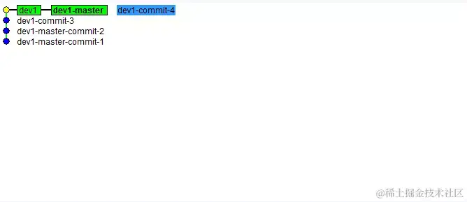 上图是使用 fast-forward 模式的时候,即 git merge ,这时候 git reset HEAD^ --hard,整个分支会回退到 dev1-commit-3