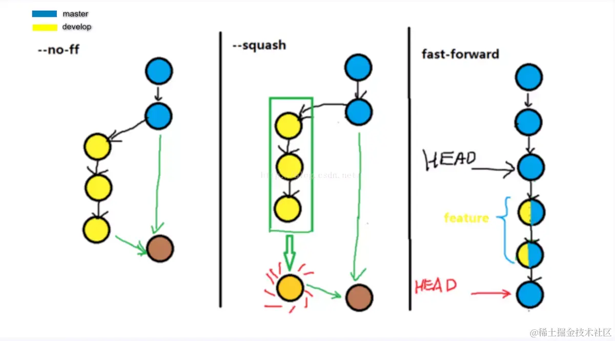 把一些不必要commit进行压缩,比如说,你的feature在开发的时候写的commit很乱,那么我们合并的时候不希望把这些历史commit带过来,于是使用–squash进行合并,此时文件已经同合并后一样了,但不移动HEAD,不提交。需要进行一次额外的commit来“总结”一下,然后完成最终的合并。