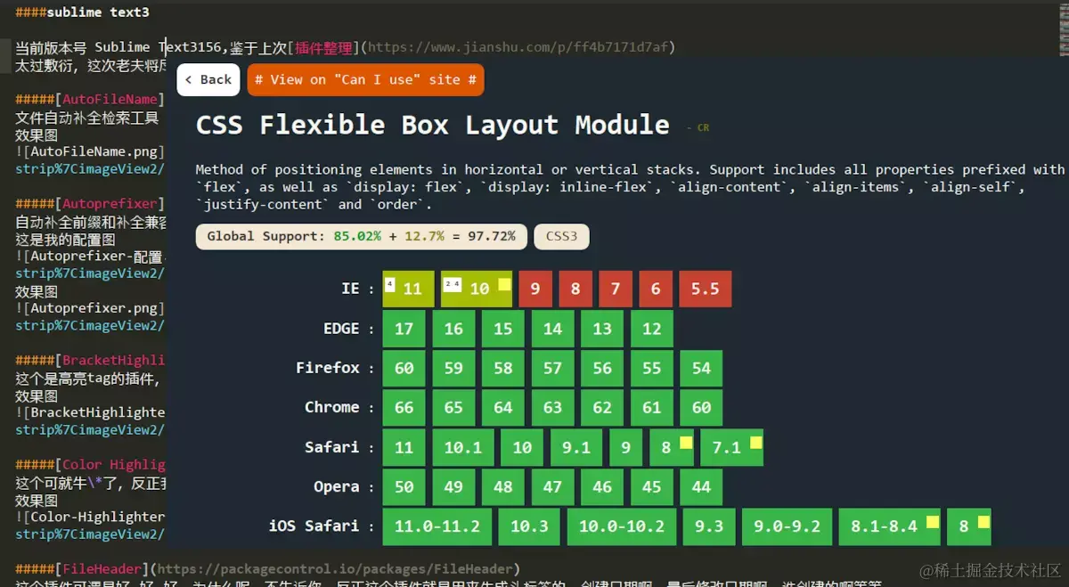 他有很多功能,其中还有一个装逼功能,就是将Can I Use上的兼容情况已内嵌图表的形式让我们在sublime中查看,但是这个功能对sublime版本有限制,具体是哪个版本已上我忘了,没错忘了,自己去找。看图: