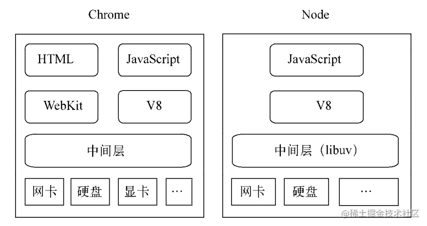 在 Node.js 出现之前,JavaScript 只能在浏览器中使用。而 Node.js 的出现打破了这个局面。以下为 Chrome 浏览器和 Node.js 的组件构成。