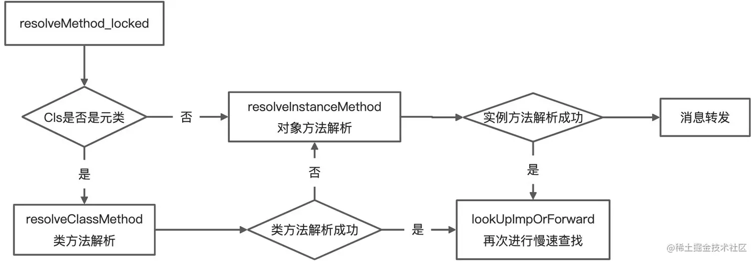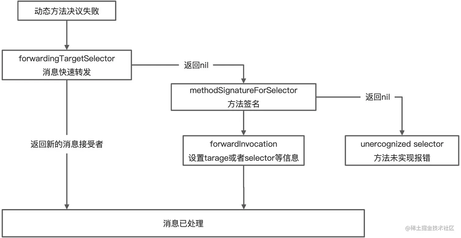 动态方法决议:慢速查找流程未找到时,会执行一次动态方法决议,动态方法决议之后会重新在进行一次慢速查找流程。消息转发:如果动态方法决议仍然没找到实现,则进行消息转发,消息转发又分为快速转发流程和慢速转发流程。