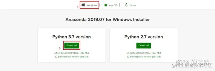 Anaconda 是跨平台的,有 Windows、macOS、Linux 版本,我们这里以 Windows 版本为例,点击那个 Windows 图标。