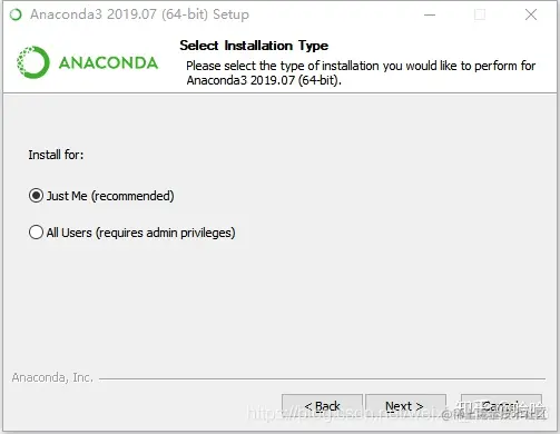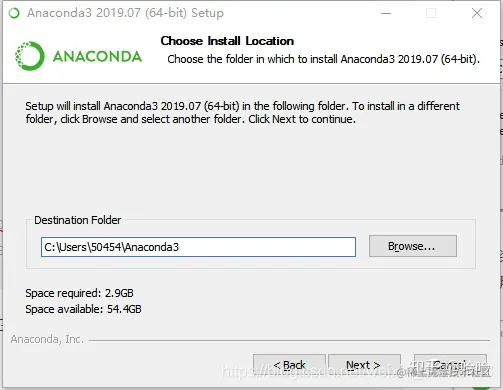 选择安装路径,这里建议装在C盘,也就是默认安装位置。(我的用户名是50454,大家选择Just me之后,路径就会自动选择在自己的windows账户下,默认是Administrator)安装完大概3个G,如果C盘空间很紧张也可以装在其他盘,但将来我们在使用时在读取速率上可能会有一定的影响。选择好了之后点击Next