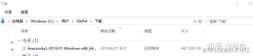 安装包有 486MB,因为网速的关系,下载时间可能会比较长,请耐心等待。我这里下载完成 Anaconda3-2019.07-Windows-x86_64.exe文件了。