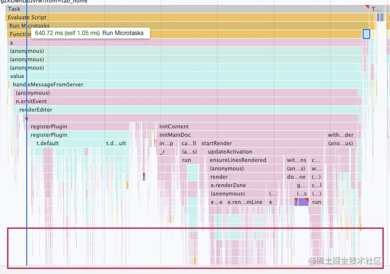 下图是 Doc 打开流程的的 performance trace,火焰图最下方非常细碎(<10ms),简单看没有发现明显性能问题。 难道要把每个细碎的小块都要看一遍?一个个优化掉?