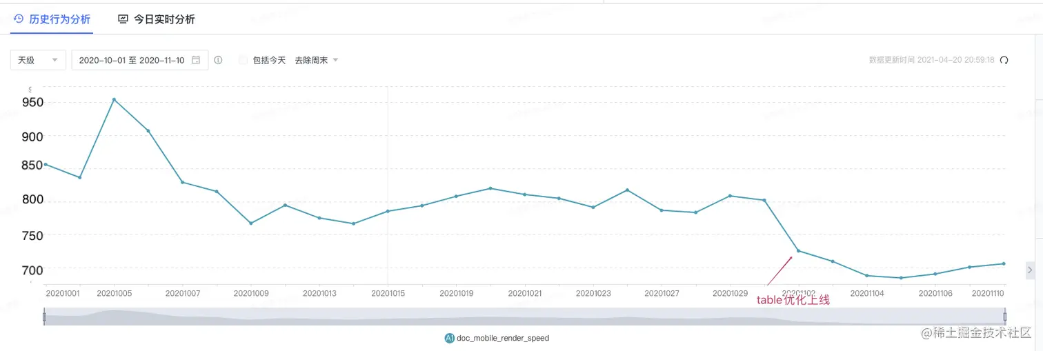 我花了点时间进行优化,将 Table 在首屏的渲染耗时降为原来 50%,上线后观察大盘数据:
