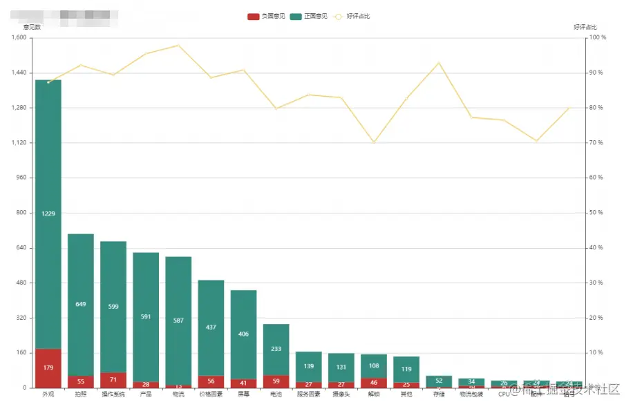 ② **差评率:**外观、操作系统、电池、价格、拍照负面意见最多;