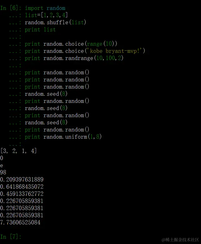 print random.choice(range(10))#从序列的元素中随机挑选一个元素