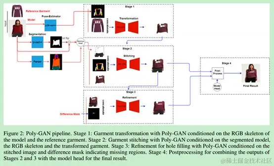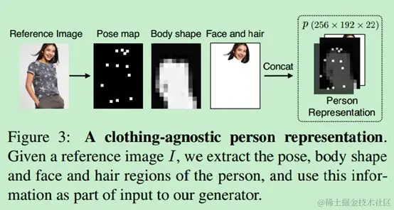 一作Han目前就职于虎牙直播,该文主要对上身换装。比如,为了让猪八戒换上旗袍,哈哈,论文会首先提取二师兄的姿态骨骼点、身体形状二值图、头部三部分构成“不带衣服信息的身体表征”,加上旗袍图像,作为网络的输入,通过两阶段网络,由粗到细地生成“穿上旗袍的天蓬元帅”。