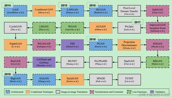 论文里有个很棒的Timeline of the GANs 的图,提及的29个GAN基本算是蛮经典的了,已经它们打包下载好,可关注微信公众号“学点诗歌和AI知识”回复“29GAN”,来获得所有论文网盘下载地址哦。