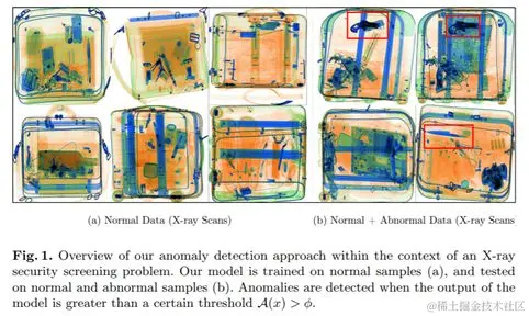 在图像方面,比如每天出入地铁安检,常常看到小姐姐小哥哥们坐在那盯着你的行李过检图像,类似如下(图来自GANomaly论文):