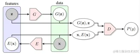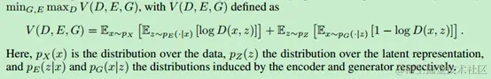 训练时,同时学习将输入样本x映射到潜在表示z的编码器E,以及生成器G和判别器D: