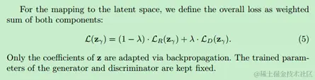 随机采样一个高斯噪声向量z,想要通过已经训练好的G生成一幅和测试图像x对应的正常图像G(z)。G的参数是固定的,它只能生成落在正常数据分布的图像。但此时仍需进行训练,把z看成待更新的参数,通过比较G(z)和x的差异去更新,从而生成一个与x尽可能相似、理想对应的正常图像。