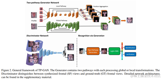 本文提出了一种两路生成对抗性网络(TP-GAN),用于通过同时感知全局结构和局部细节来实现逼真的正面视图合成。除了常用的全局编码器/解码器网络之外,还提出了四个局部块网络来处理局部纹理。此外,引入对抗性损失,对称性损失和身份保留损失的损失组合。