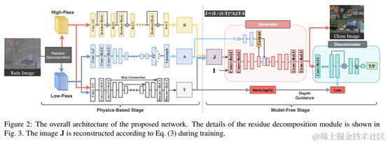 第一阶段估算rain streaks、transmission和atmospheric light,即估计出由潜在物理属性控制的雨点集合S、transmission map T、环境光强A。为了更可靠地找出这些分量,使用了filtering框架将图像分解为低频分量和高频分量。filtering的过程由没有雨的残差图像指导,该图像以空间变化的方式为两个通道设置passband,使得背景细节不与雨纹混为一体。