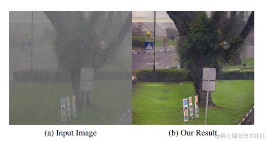 在真实数据集和合成数据集上进行的大量实验表明了方法的先进性。此外,在不做任何修改的情况下在除雾方面也实现了良好的视觉效果。
