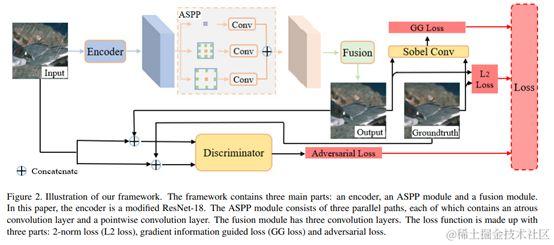 具体而言,经过修改的ResNet-18提取了雨天图像的深层特征,并修改了ASPP结构,以适应雨滴条纹的各种形状和大小,从而构成了网络的骨干。考虑到降雨处的梯度更突出的特点,引入了梯度损失以帮助监督训练过程,为此,构建了Sobel卷积层以灵活地提取梯度信息。为进一步提高性能,采用了对抗性学习方案来训练网络。
