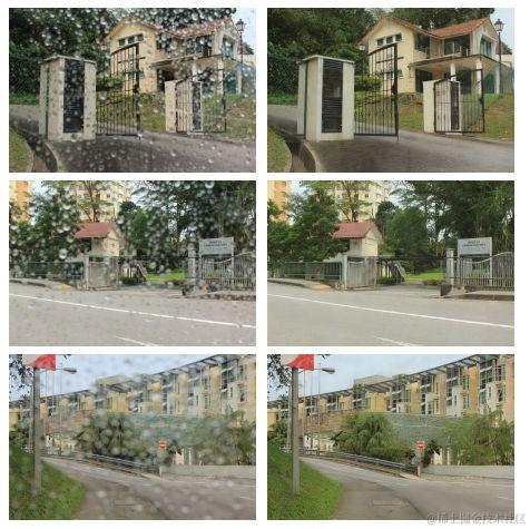 附着在玻璃窗或相机镜头上的雨滴严重妨碍了背景场景的可见性,并大大降低图像质量。本文解决的问题是:通过视觉上去除雨滴。这是棘手的,因为被大片雨滴遮挡的部分未知的。