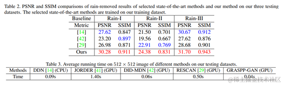该方法在合成图像和真实图像上进行的实验评估表明,在定量和视觉性能方面,优于许多最新技术。此外,使用FasterRCNN在目标检测数据集上评估的实验结果也证明,可以有效提高对带雨水图像的检测性能。