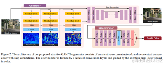 为了解决这个问题,使用的是带注意力的生成对抗网路。主要想法是将视觉注意力注入生成和对抗网络,在训练时,视觉注意力会了解雨滴区域及其周围的环境。因此,生成网络将更加关注雨滴区域和周围的结构,判别网络会评估恢复区域在图像中的一致性。