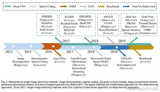 本文展示了单图像去雨方法的里程碑式工作、回顾了不同类别的大量工作,并提供了从基于模型的方法到数据驱动方法的历史发展路线的描述。也在性能比较上进行了定性和定量的总结。