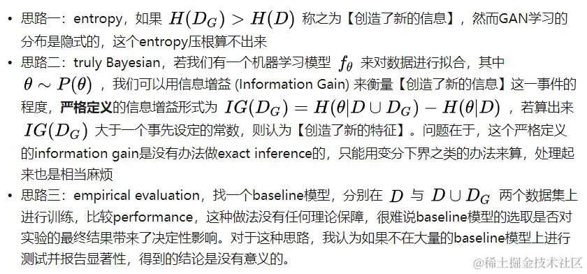 我个人觉得使用‘创造了信息’这个说法是不恰当的,因为从物理上说,信息是不能创造和消灭的,我们只能说,GAN是否可以生成一组数据来实质性的改善数据不足的问题,以及考察这个能力的获取的源头在哪里。
