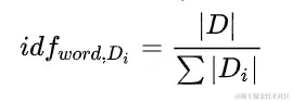 2.计算逆向文本频率(IDF) ,先计算文本总数除以包含该词的文档数,为了防止分母等于0,在分母的位置加上1,在完成除法计算后取对数。