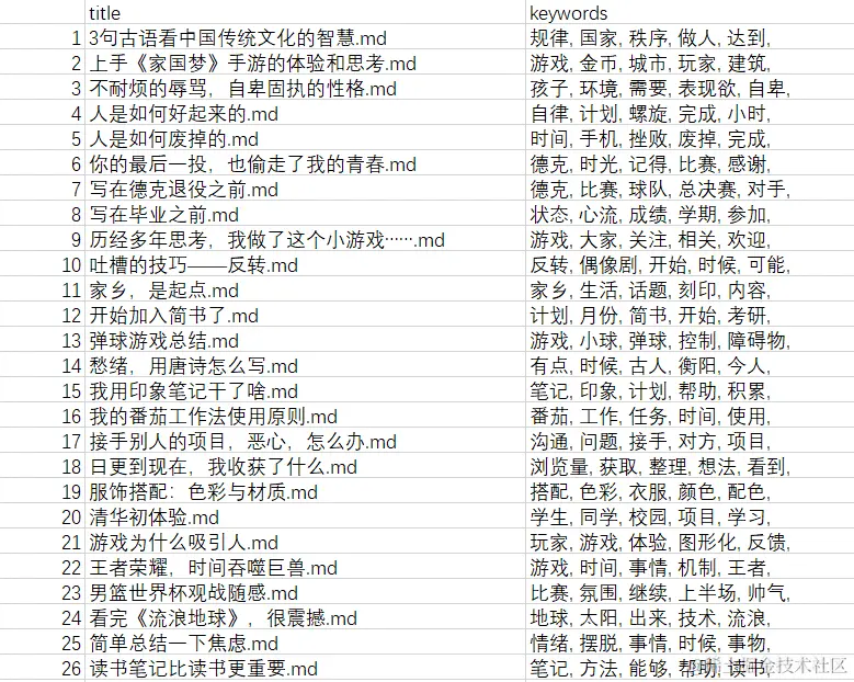 为了看到分词效果,把结果输出到csv中。从结果看还是很不错的,比如在《人是如何废掉的》这篇文章中,把 “手机” 和 “挫败” 这两个关键词找出来了,在《人是如何好起来的》中把 “自律” 和 “计划” 找出来了。这两篇一年前写的文章对一年后的生活依然能够有很好的概括,解决措施也完全适用,果然还是知易行难。