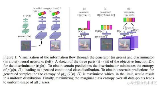 判别器的角度:它应该(i)对样本的类别可以确定,(ii)对生成的样本的类别难以确定(分不清),(iii)平等地使用所有类别。