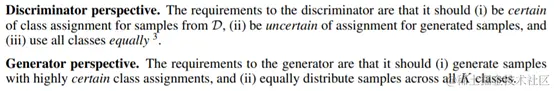 生成器的角度:它应该(i)生成使得判别器具有高度确定的类别的样本,(ii)在所有K类中平均分配样本。